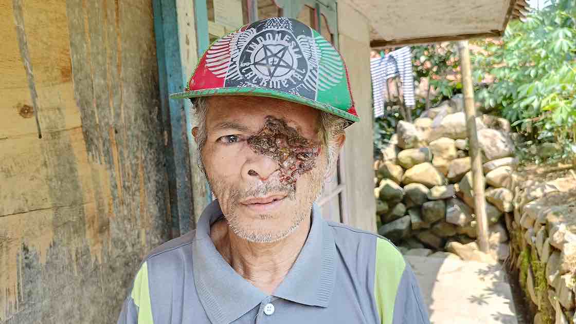 Bola mata sebelah kiri telah hilang, hampir setengah wajah Abah Koko pun sudah hancur akibat kanker kulit yang tak kunjung diobati.