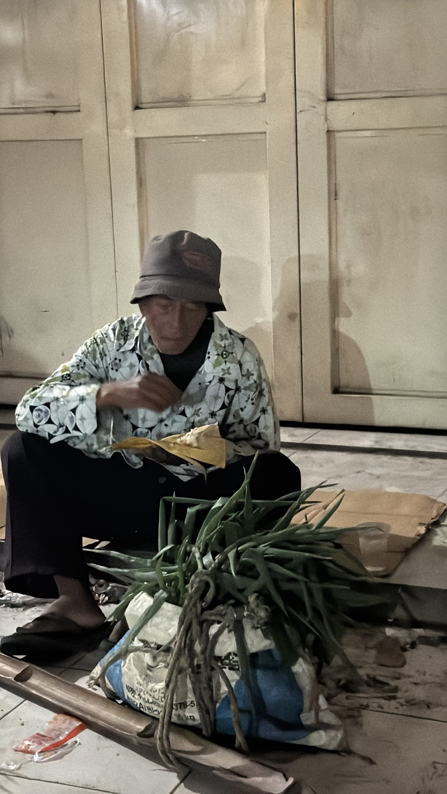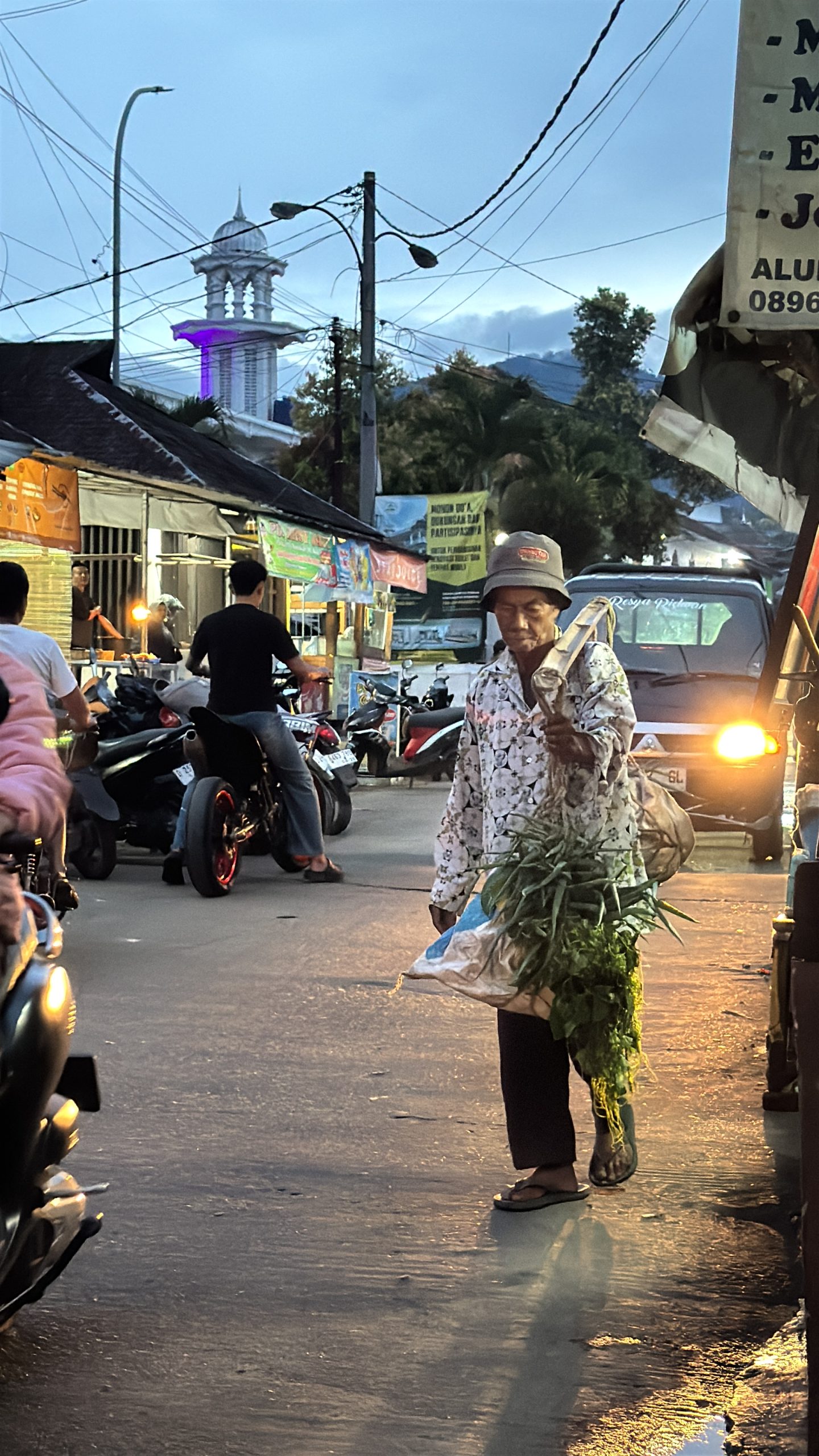 Dengan langkah yang sudah rengkuh, Abah Karna memikul dua karung sayuran di pundaknya.